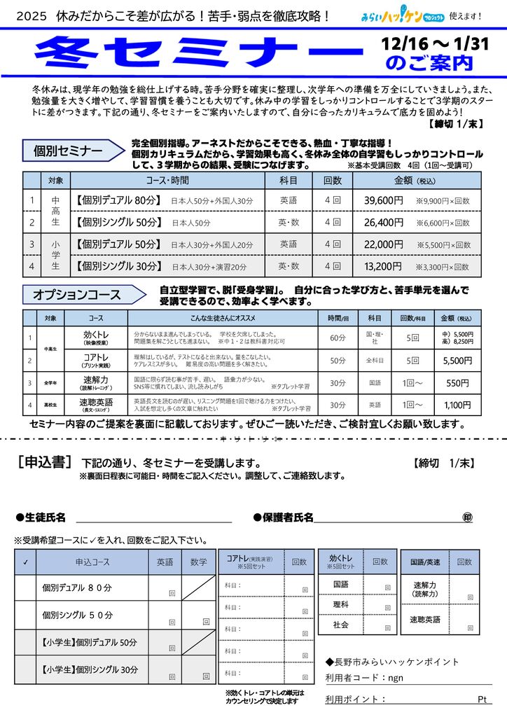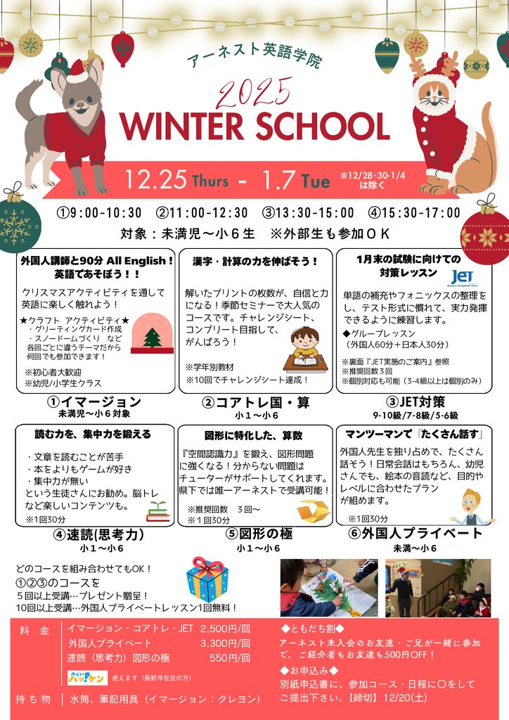 ウィンタースクール 12/25(木)~1/7(水)